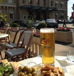 Monaco'ya gelip de bu lüks meydanda oturmamak olmaz diyerek meydana bakan Cafe de Paris' e oturduk. Şansımıza hem de birinci sırada yer bulduk. Dış alanda sadece içecek ve tatlı servisi yapılıyormuş, iç kısımda ise yemek. Karnımız acıkmıştı ama iç kısma oturmak da hiç istemiyorduk. Garsona sorunca sadece klüp sandviç var yiyecek olarak dedi, tamam hayalimizdeki öğle yemeği bu değildi ama hava o kadar güzeldi ki kapalı kısımda oturmayı hiç istemedik. Sandviçlerin yanına iki de bira söyledik ve gelen geçeni izlemeye başladık.