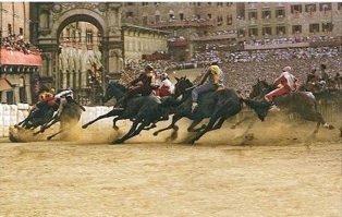 Piazza del Compo aynı zamanda meşhur at yarışlarıyla ünlü. At yarışlarının düzenlendiği meydanın çevresini toprak bir hat oluşturuyor. Birkaç gün farkla at yarışlarını kaçırdığımız için üzülsek de, belki Siena'ya tekrar gelmemiz için bir bahane olur diye düşünmeden de edemedik aslında.