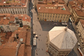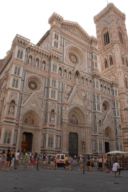 "Duomo" yani katedral, kentin merkezinde tüm görkemiyle yer alıyor ve rehber kitabımızın bize söylediğine göre, bugün bile kentin en yüksek yapısı olma özelliğini koruyor. Duomo'nun batısında yer alan kapılarıyla ünlü "Battistero" yani "Vaftizhane" Floransa'nın en eski yapılarından biriymiş. Duomo'ya bitişik olarak inşa edilmiş olan "Campanile" yani "Çan Kulesi" 85 m. yüksekliğinde ye Duomo'nun kubbesinden yaklaşık 6 m. alçak.