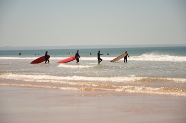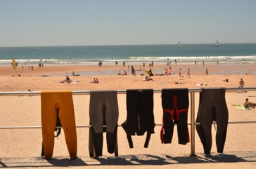 Çok uzun olmasa da eni çok geniş bir kumsaldı burası.. Portekiz'de yaz sezonu açılmıştı çoktan :) birkaç büfe ve restoran vardı yol tarafında. Acaba denize girer miyiz, hayallah mayoları da almadık yanımıza diye düşünürken bir yandan ayakkabılarımızı çıkardık ve sahilde yürüdük. Okyanus suyu o kadar soğuktu ki zaten girmemiz mümkün değildi. En azından ayaklarımızı soktuk suya.. Zaten denizdeki insanlardan daha çok sahilde güneşlenen insanlar vardı.