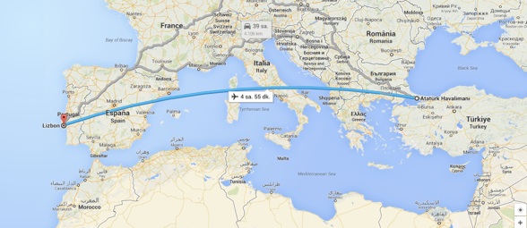 THY'nin Atatürk Havalimanı'ndan sabah 7:30 seferi ile Lizbon'a uçtuk. İstanbul'dan Lizbon'a direkt uçmanın tek yolu THY. Uçuş yaklaşık 5 saat sürüyor. Avrupa'da başka bir şehirden aktarmalı da uçulabilir. Biz sabah 7:30 uçağı ile gidiş, pazar 14:50 uçağı ile dönüş olacak şekilde iki kişi toplam 846 € verdik uçak biletlerine.