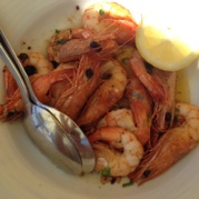 Yemek olarak başlangıçlardan "shrimp loins fried with garlic (15 €)", portuguese style mussels (15€) söyledik, ana yemek olarak ise "bacalhau lagarerio / cod grilled in olive oil with garlic" (21 €) içecek olarak ise soda (3,50 €) ve house wine (20 €). Hesaba ilave edilen kuver kişibaşı 4 €'ydu.