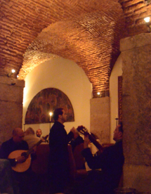 Fado performansı sırasında yemek servisi yapılmıyor ve ortamın ışıkları karartılıyor. İki gitarist hep aynı kaldı ama solist değişti.