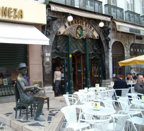 Saat 12:30 civarında Lizbon'daki evimize veda ederek sırtımızda çantalarımız yola çıktık. Havalimanına gitmeden önce Baxia-Chiada istasyonunun hemen karşısında yer alan "A Brasileria"nın dışarıda yer alan masalarına oturduk. Bu cafe oldukça eski bir tarihe sahip cafenin dışarıda yer alan masalarının birisi de bir heykele ev sahipliği yapıyor. Bu bronz masada oturan bronz heykel, Fernando Pessoa isimli ünlü bir şairmiş ve şair cafenin müdavimlerindenmiş.