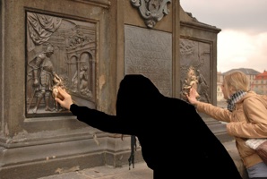 Bu heykeller arasında en çok ilgi çekenlerden birinin, “Aziz John Nepomuk’un heykeli” olduğunu öğreniyoruz. Efsaneye göre Aziz, öldürülüp Karl Köprüsü’nden atılmış. Zamanla bu azizin heykeline dokunmanın dilekleri gerçekleştirdiği inancı yayılmış. Günümüzde köprüyü geçen turistler de bu heykele dokunup dilek tutuyorlar. Bu nedenle turistlerin dokunduğu kısım heykelin diğer kısımlarına göre pırıl pırıl..
