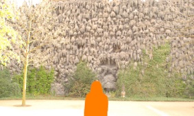 Bahçeye girdiğinizde bu yemyeşil ve huzurlu mekana biraz da aykırı gibi görünen siyah kiraçtaşı sarkıtlardan oluşan duvar dikkatinizi çekecektir.