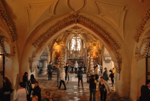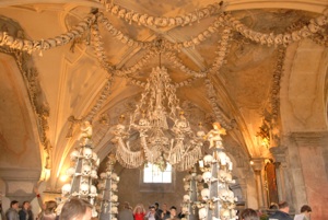 Burada yer alan manastır, kilise ve mezarlıktan oluşuyor. Bu kilisenin oldukça ilginç bir de öyküsü var. Manastırın baş rahibinin, kutsal topraklardan getirdiği bir avuç toprağı mezarlığın üzerine serpmesiyle, kutsal toprakların bir parçası haline geldiğine inanılan bu mezarlığa gömülmek isteyen kişi sayısı çok artmış. 14 yy.da bölgede çıkan veba salgını, iç savaşlar derken mezarlık büyümüş ve yetersiz hale gelmiş. 16. yy.da mezarlığın daraltılması gündeme gelmiş ancak mezarlığa gömülmek isteyen kişi sayısındaki artış devam ediyormuş. Daraltma çalışmaları kapsamında, eski mezarlar açılmış, çıkarılan kemikler, yaşayanlara ölümü hatırlatmak için kilisenin bahçesine ve piramit şeklinde içerisine yığılmış. 17. yy.da ilk kez kilisenin dekorunda bu kemikler kullanılmaya başlanmış, 19 yy.da ise manastırın Swarzenberg ailesinin eline geçmesiyle, Çek ahşap oymacısı Frantişek Rint tarafından kilisenin her yerinde kemiklerle süslenen bugünkü dekorasyonu yapılmış. Kilisede minimum 40 bin insanın kemiğini bulunuyormuş. Dünyanın hiç bir yerinde eşi olmayan bu kilise, oldukça ilginç ve bir tüyler ürpertici.