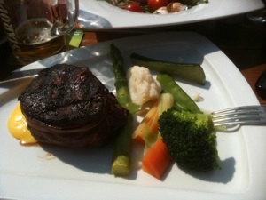 “beef steak wrapped in bacon served with bearnaise souce and fresh vegetables”