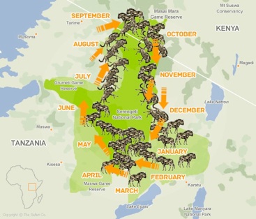 Serengeti, hayvanların içgüdüsel bir şekilde adeta bir daire çizerek her yıl yaptıkları göç yolunu içinde barındırıyor. Gnu’ların (öküz başlı antilop ya da afrika antiloplarının) dairesel göç haraketi Serengeti’nin güneyinden başlıyor. Mevsimin değişmesi ve yağmurla yeşeren yeni otlar “büyük göç”ün rotasını çiziyor. Ocak – Mart ayları arasında da doğumlar başlıyor. Şubat ayı boyunca gnu’lar Serengeti’nin güney doğusunda kısa otları yiyeyek ilerlerliyorlar ve 2-3 haftalık dönem içinde yaklaşık 500 bin yavru dünyaya getiriyorlar.
