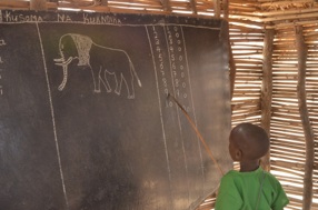 Daha sonra yine çalılardan oluşturulmuş okula girdik. Bir kara tahta, çocukların oturması için 3-4 sıra vardı. Okula girer girmez çocuklar bizi bekliyormuşcasına şarkı söylemeye başladılar. Sonra içlerinden biri tahtaya kalktı ve rakamları hep bir ağızdan İngilizce olarak saydılar. Okulda da bir yardım kutusu vardı. Kırtasiye malzemeleri almak için yardım topluyorlarmış. İçimizdeki yardımseverliği dinledik ve kutuya 3-5 usd attık.