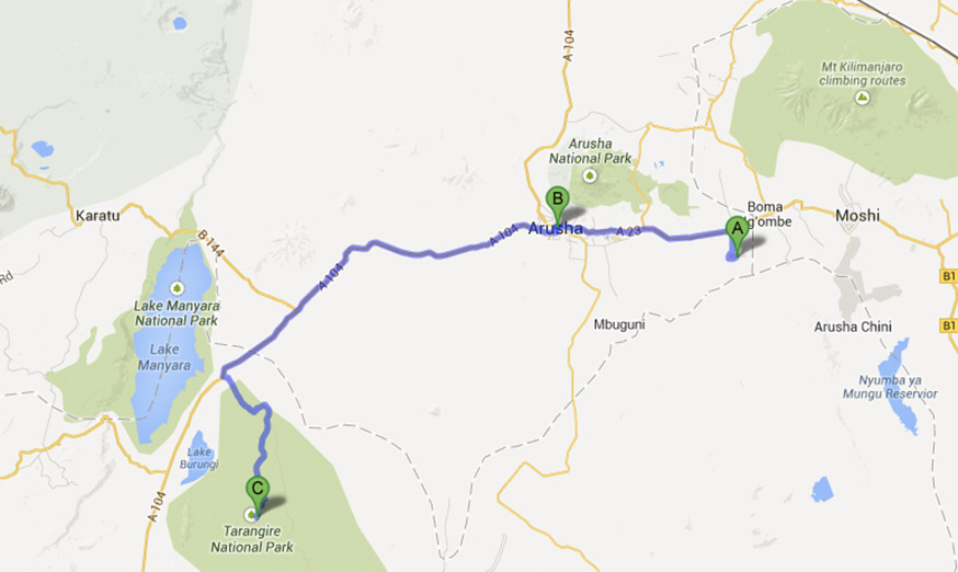 Havaalanı çıkışında, Kilimanjaro dağı, zirvesindeki karları ve tüm görkemi ile Afrika kıtasının en yüksek noktası olduğunu ilan ediyordu herkese.  Kilimanjaro havalimanı Arusha arası yaklaşık 50 km ve bir saat sürüyor. Genellikle düz, tek gidiş tek geliş bir yol. Yol boyunca yol kenarında yürüyen ve bisikletli insanlar gördük.