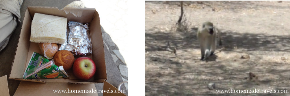 Milli parkın giriş kapısına ulaştığımızda saat 12:00 olmuştu. Andrew öğle yemeklerimizi birer karton kutu içinde bize verdi. O milli park giriş işlemlerini hallederken biz de kumanyalarımızı yemek için piknik alanına yerleştik. Öğlen yemeği menüsünde iki sandviç, mango suyu, elma, kek, ızgara tavuk ve ne olduğunu tam anlayamadığım bir sebze kızartması vardı. Bizim gibi birşeyler yiyen 3-4 kişi daha vardı ve ağaçlarda ve etrafta maymunlar dolaşıyordu. Aaaa bir tanesi bize doğru geliyor, fotoğraf makinesi nerde dememe kalmadan sandviçimin birini maymuna kaptırmam bir oldu. Böyle bir olasılık olduğunu bilmeme rağmen nasıl oldu da yemeğime sahip çıkamadım şaşırdım kaldım, maymun o kadar hızlıca ve ustalıkla kaptı ki sandviçi inanamadım.