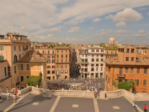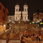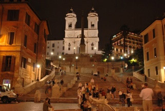 Merdivenler üzerinde oturmuş yerel insanlar ve turistlerle dolu. Merdivenlerin başladığı meydan, Piazza di Spagna yani İspanyol Meydanı.